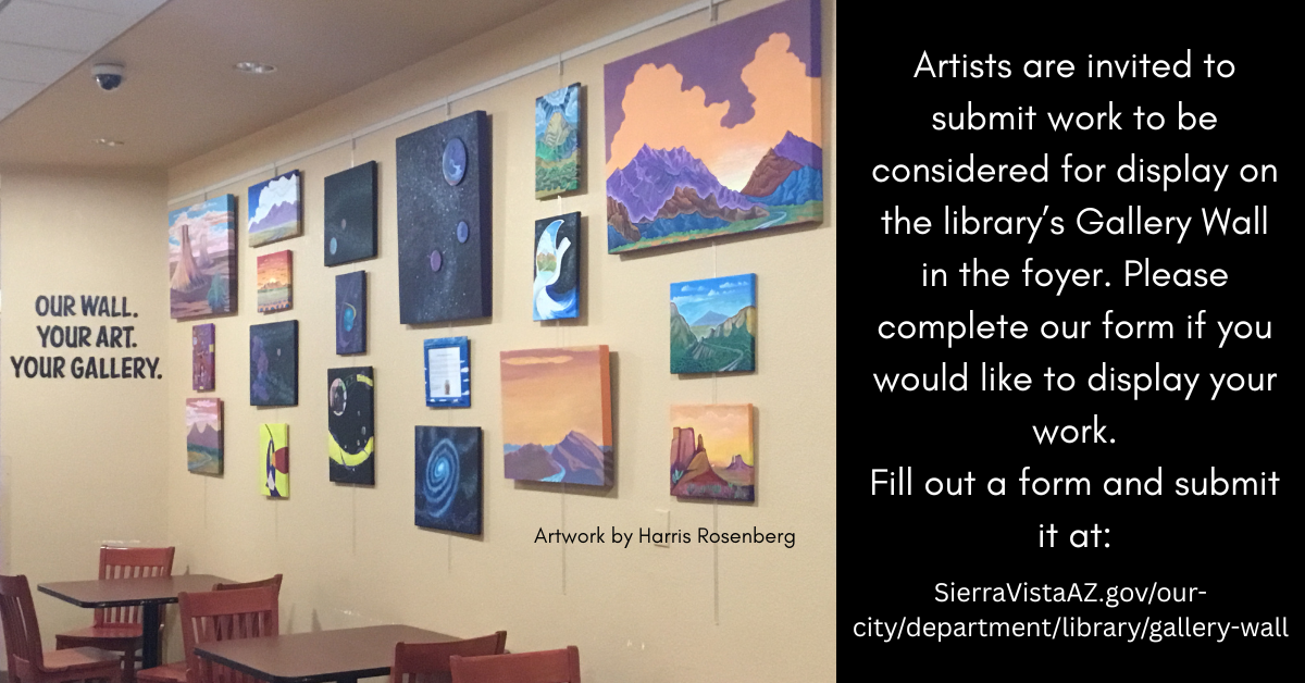 Artists are invited to submit work to be considered for display on the library’s Gallery Wall in the foyer. Please complete this form if you would like to display your work.